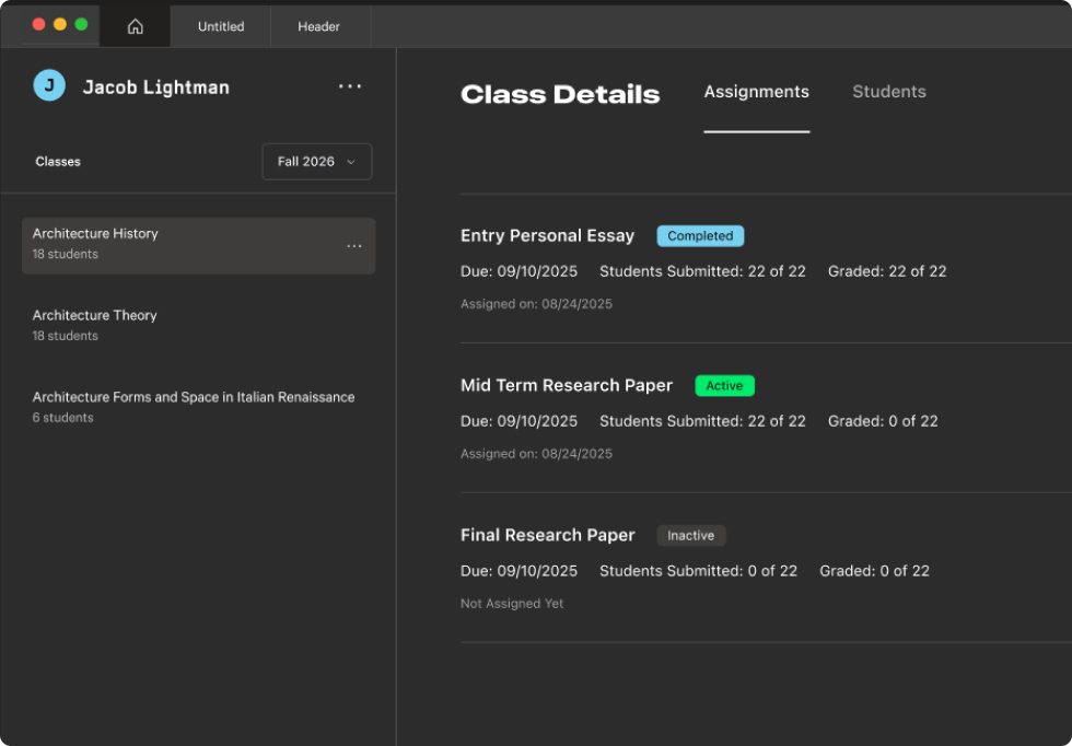 Students and teachers can organize and manage all of their writing assignments in a single, easy-to-use workspace. Teachers can assign, review, and give feedback seamlessly, while students track drafts and revisions without switching between tools.